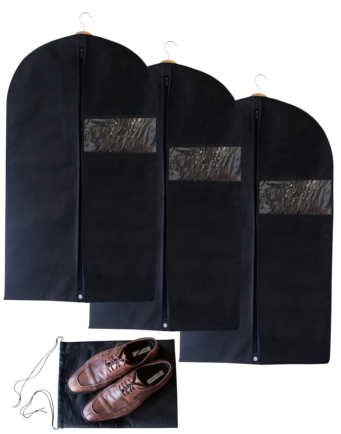 Set of 3 Breathable Garment Bags with FREE Shoe Bag — Has clear window, reinforced opening and zipper — Premium suit cover that also works for dresses & other linens –Perfect for storage or travel