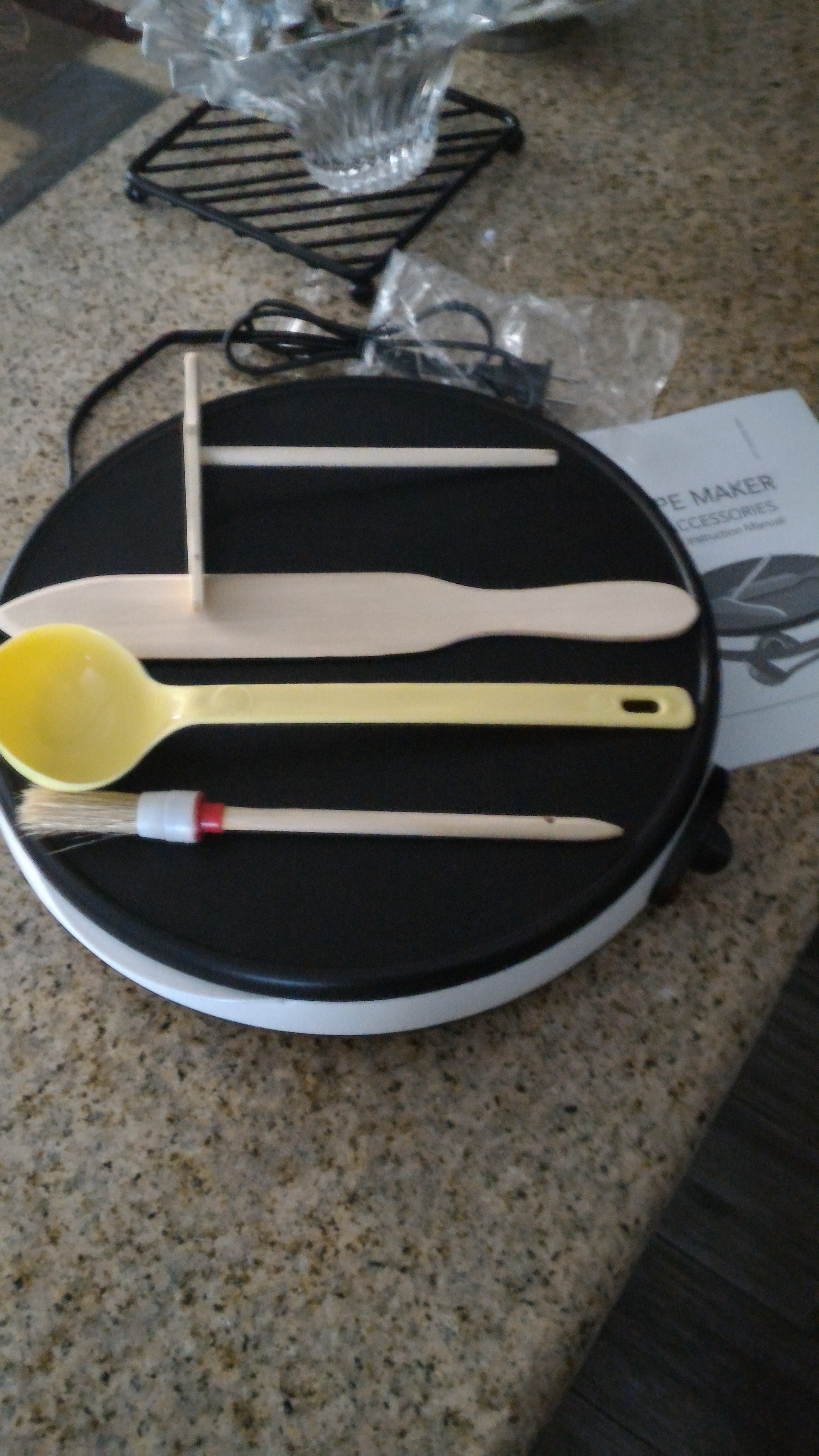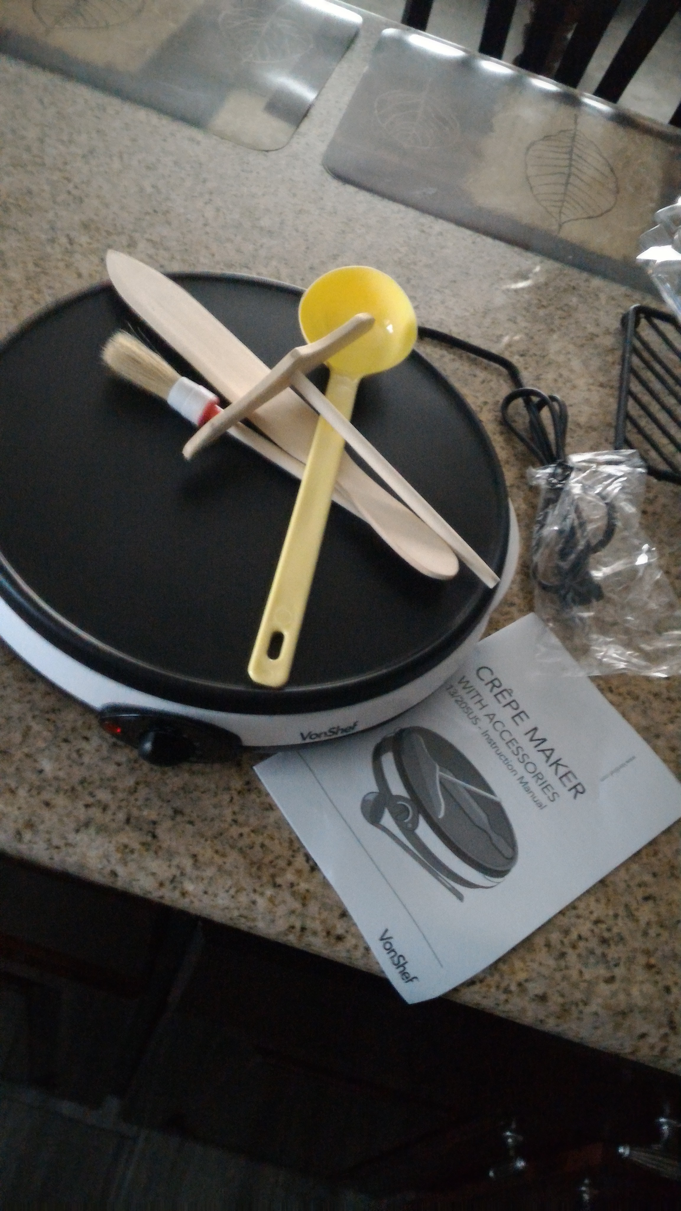 Overall: This crepe and pancake maker is super awesome! I can make all those fancy crepes that I always wanted to make and also make perfect pancakes every time! This crepe maker has an adjustable very powerful 1200W heating element, good sized, nonstick coating, easy to use, raised edges, and free batter spreader, oil brush, wooden spatula, and ladle!