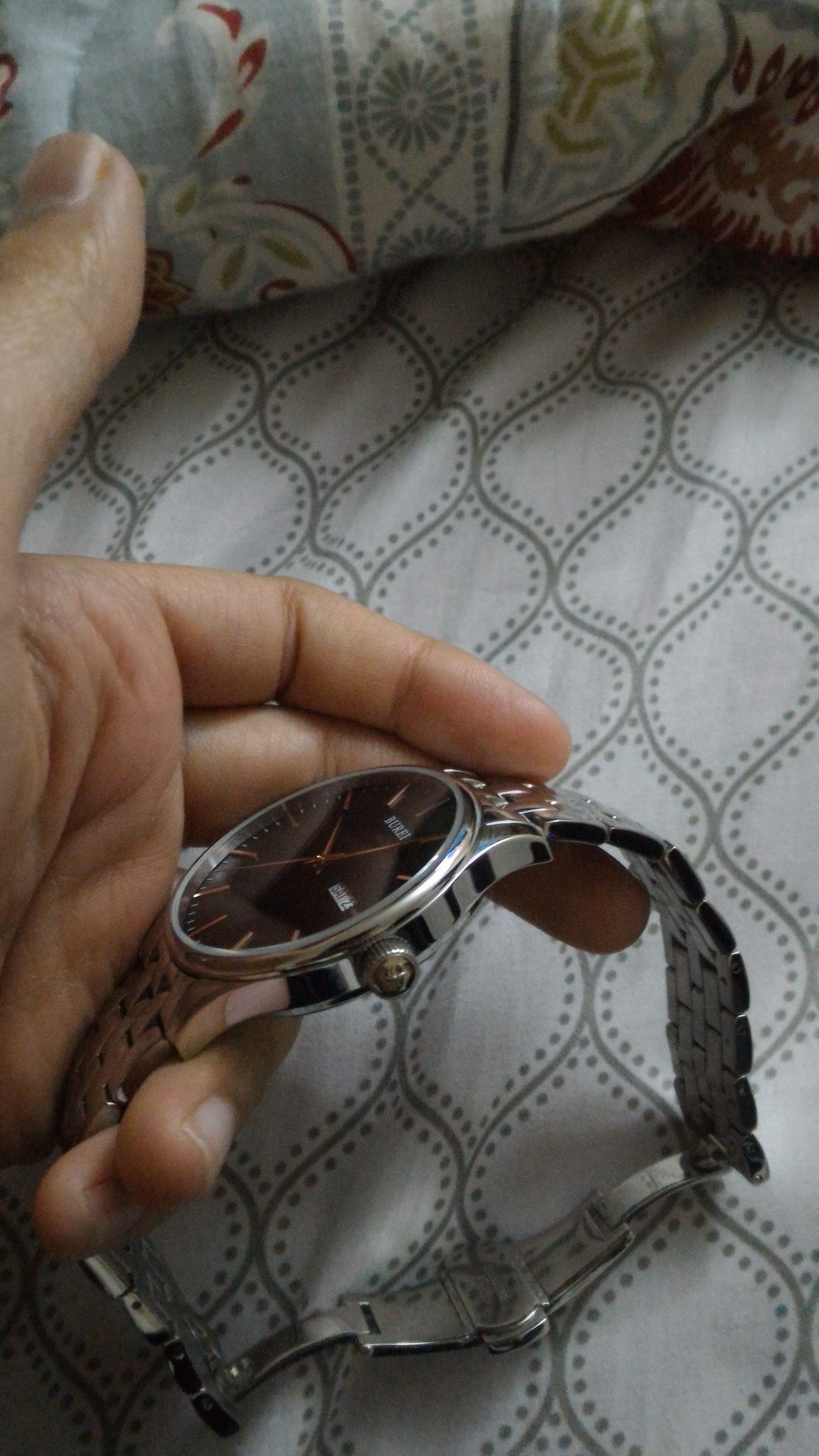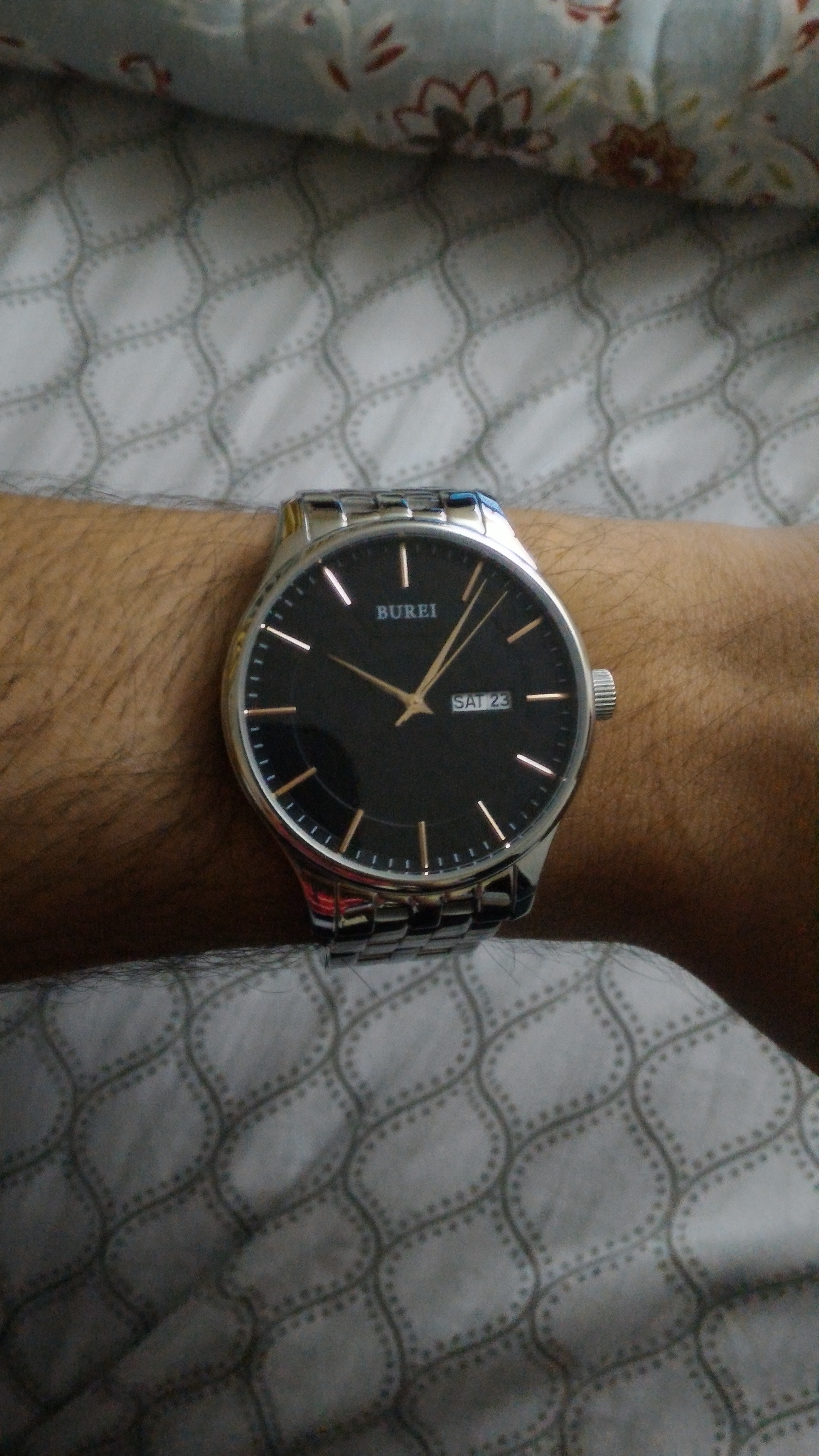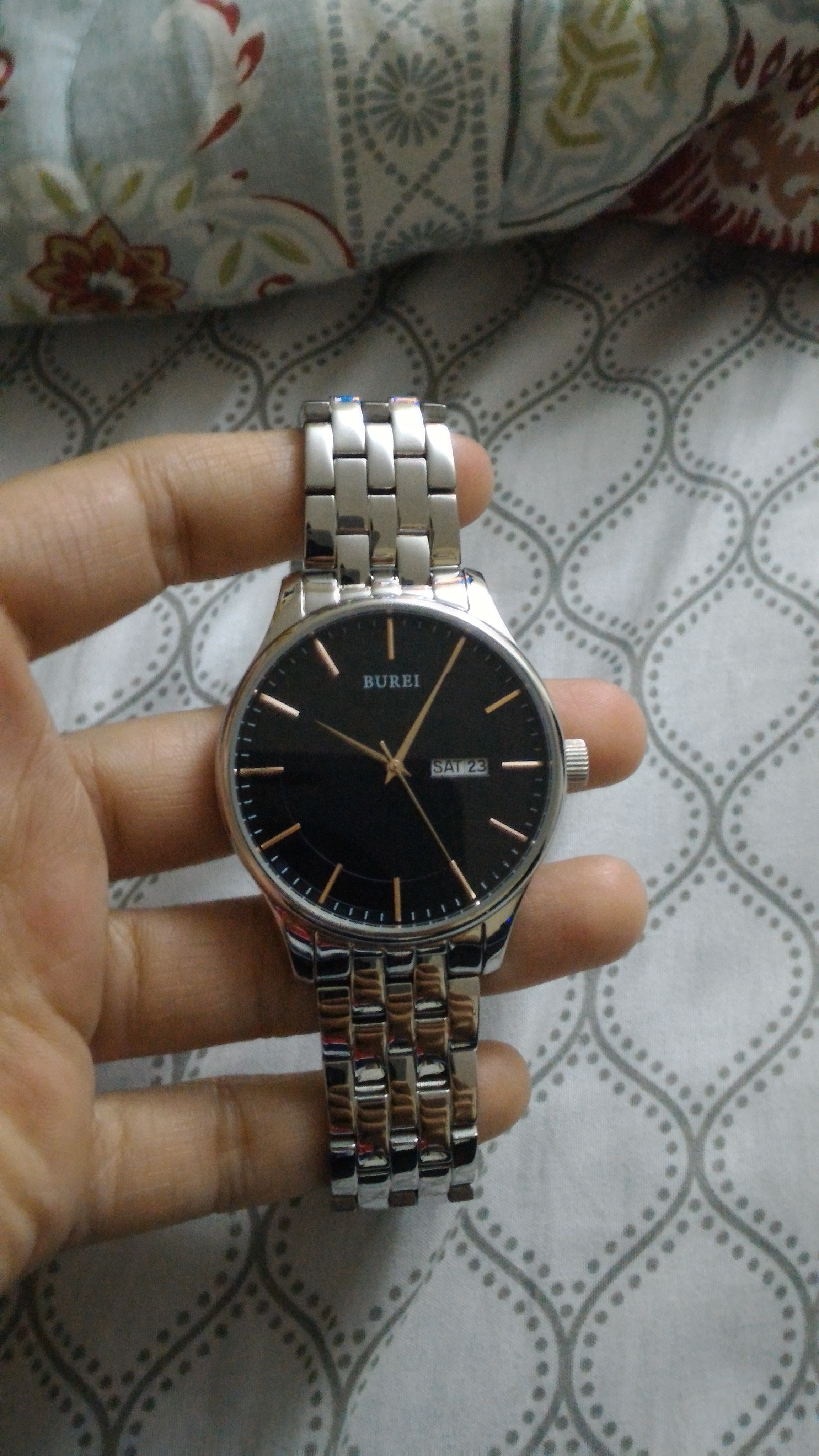 Overall: This watch has a great simplistic design with its black face, rose gold accents, day and date functions, and stainless steel band which makes it perfect for wearing it as an everyday dress watch or as a casual watch! It is a Japanese Quartz movement, water resistant up to 30 meters, and the rose gold accents make the watch very appealing! It also makes a great gift because it is very nicely packaged!